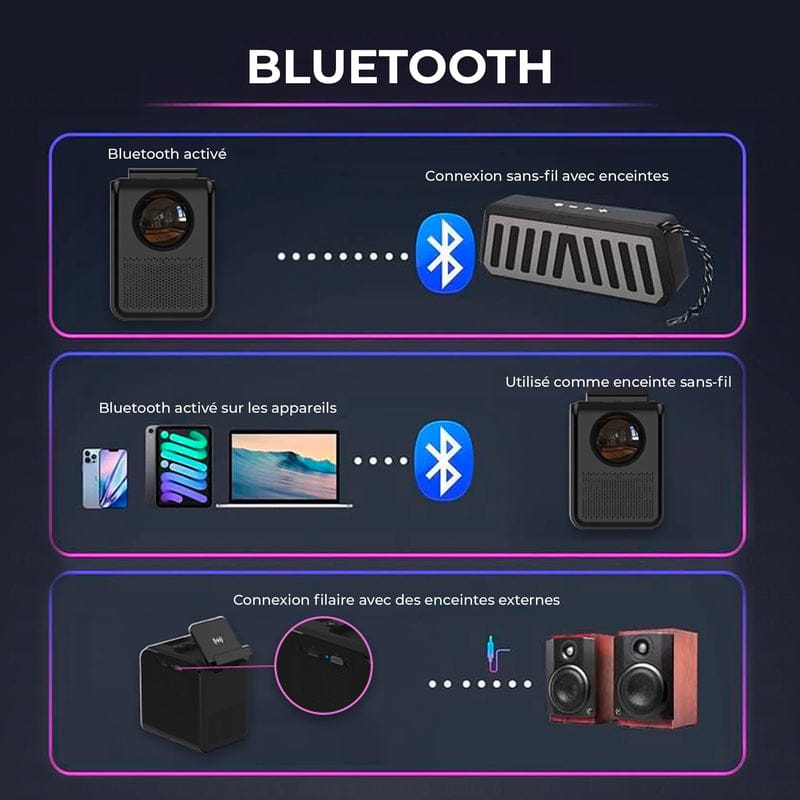 Connectez facilement votre smartphone, tablette ou ordinateur portable au projecteur, offrant ainsi une expérience de projection sans tracas. La technologie Bluetooth intégrée offre une liberté totale, vous permettant de contrôler le projecteur à distance et d'apprécier vos médias préférés avec une simplicité inégalée.