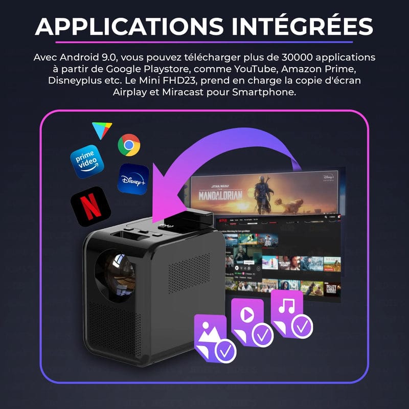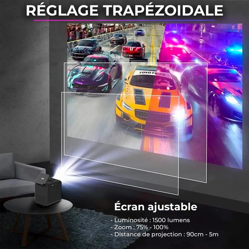 Notre projecteur est conçu pour s'adapter à toutes les configurations de visualisation possibles. Profitez d'une flexibilité maximale avec ses fonctionnalités ajustables, vous permettant de modifier facilement la taille et l'orientation de la projection selon vos préférences.